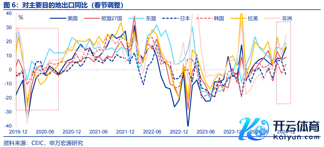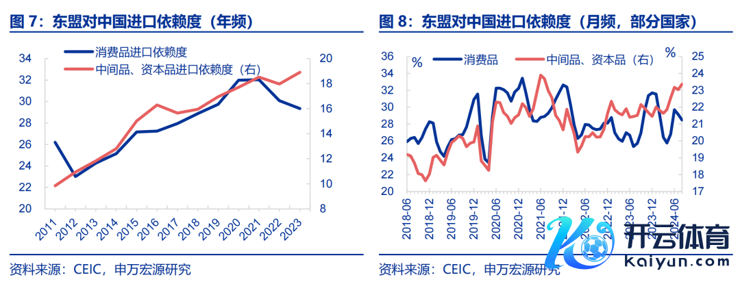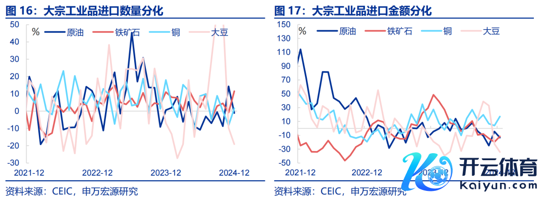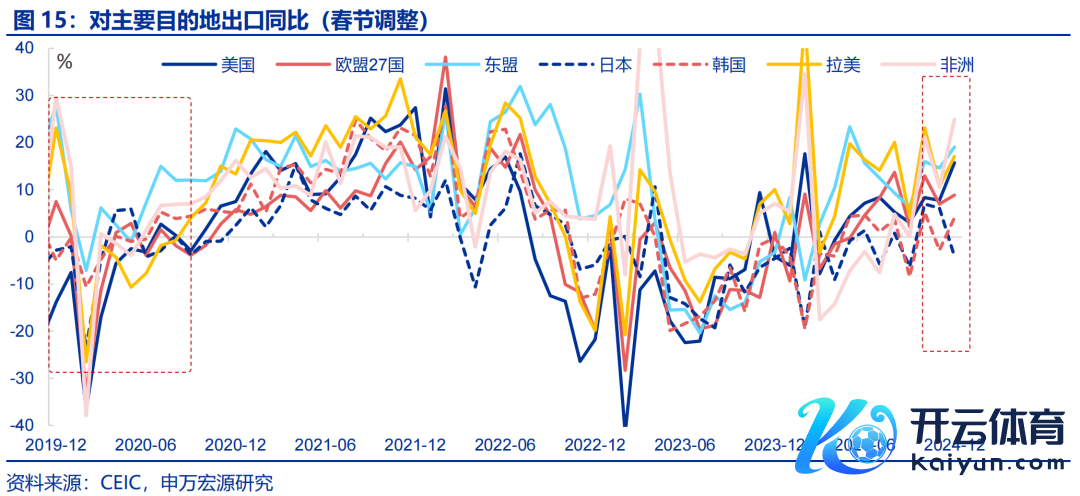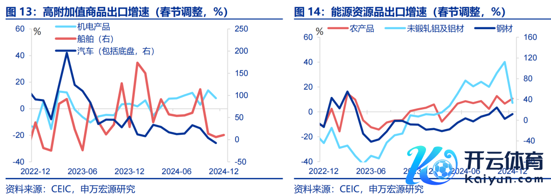 “抢出口”的第二条干线体当今对新兴国度的协同供给出口上,这与我国加快境外供应链重组以驻扎潜在关税有关。2018-2019年好意思国加征关税技艺,我国也出现境外供应链重组情势,对发达国度出口回落,但对新兴国度出口显着走强气候。12月,我国对新兴国度和地区的出口增速也好于对发达国度。其中,对非洲(+14.4pct至24.9%)、对韩国(+6.9pct至4.1%)、对拉好意思(+6.3pct至17.1%)、对东盟(+4.4pct至19.1%)出口增速均进一步改善。分商品看,中间品和成本品出口施展较好。其中,通用机械(+15.0pct至29.0%)、钢材(+9.2pct至11.8%)等较上月均显耀回升。这或反应出新式“抢出口”情势,即通过提前重组境外供应链,将坐褥费力出口至东盟等新兴国度,再加工成品后销往好意思国,以回避关税风险。2024年下半年以来东友邦家已在加快从中国入口中间品、成本品,如东盟对我国矿物与金属成品的依赖度从15.5%上涨至24.5%、对我国橡胶塑料的依赖度从31.2%上涨至38.1%。