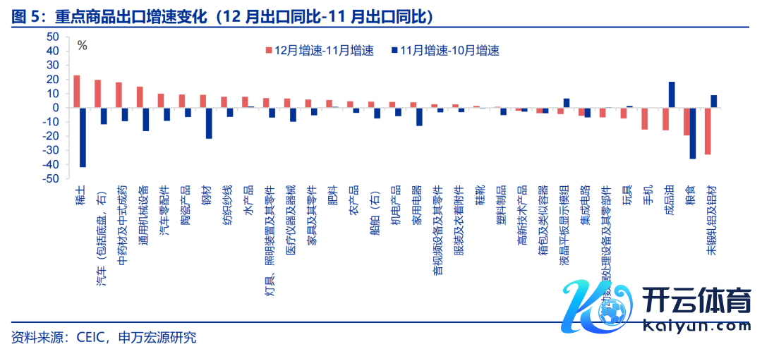 出口商品:挥霍品出口有所分化,12月手机(-15.3pct至-15.8%)、电脑(-6.7pct至9.5%)、均下行。而纺织纱线(+7.9pct至17.2%)、居品(+5.8pct至3.1%)有所回升。中间品、成本品出口举座回升,如通用机械(+15.0pct至29.0%)、汽车零部件(+10.0pct至15.6%)、稀土(+22.9pct至-11.9%)、钢材(+9.2pct至11.8%)均有所反弹。