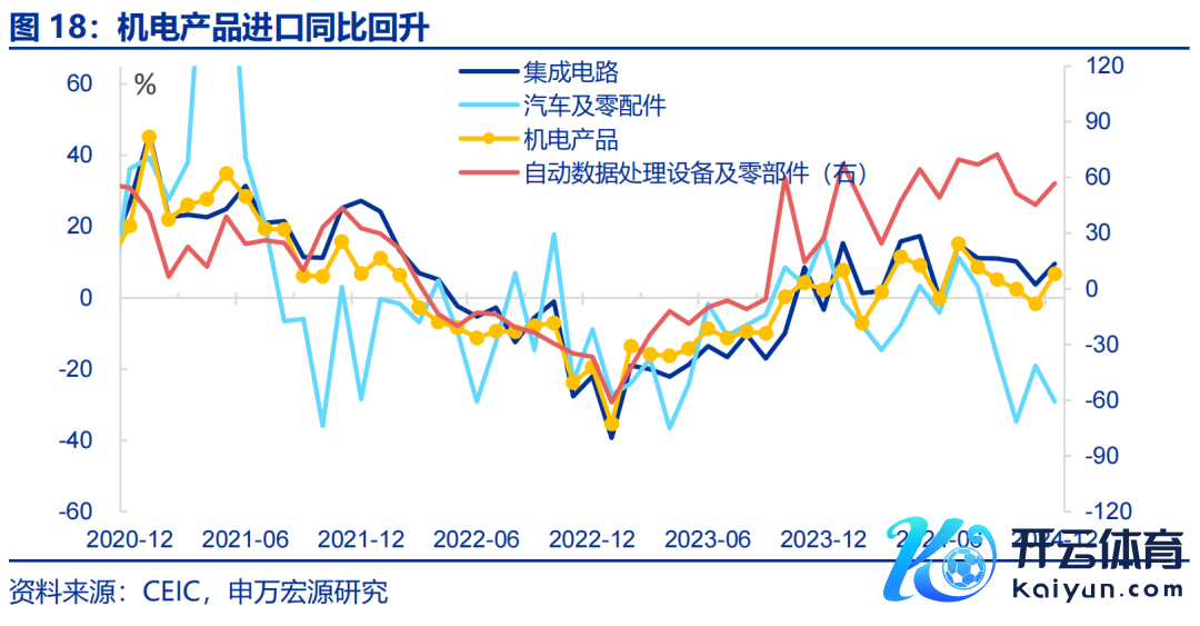 出口国别:对除日本之外的主要经济体出口增速均有所回升。发达国度方面,对好意思国(+8.0pct至15.7%)、对欧盟(+1.9pct至8.9%)、英国(+3.8pct至3.2%)出口增速均回升,但对日本(-10.2pct至-4.1%)出口增速则显耀回落。新兴国度和地区方面,对非洲(+14.4pct至24.9%)、对韩国(+6.9pct至4.1%)、对拉好意思(+6.3pct至17.1%)、对东盟(+4.4pct至19.1%)出口增速均大幅回升。