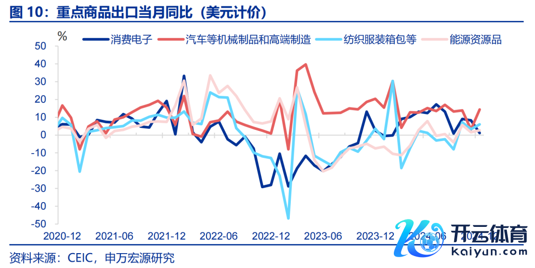 成本品、中间品出口增速举座显着回升。具体来看,汽车(+19.8pct至12.1%)、通用机械(+15.0pct至29.0%)、汽车零部件(+10.0pct至15.6%)、船舶(+4.5pct至10.5%)均显耀上行。中间品方面,稀土(+22.9pct至-11.9%)、钢材(+9.2pct至11.8%)、肥料(+5.6pct至-1.1%)有所反弹、而未锻轧铝及铝材(-32.9pct至7.2%)则较上月显着回落。