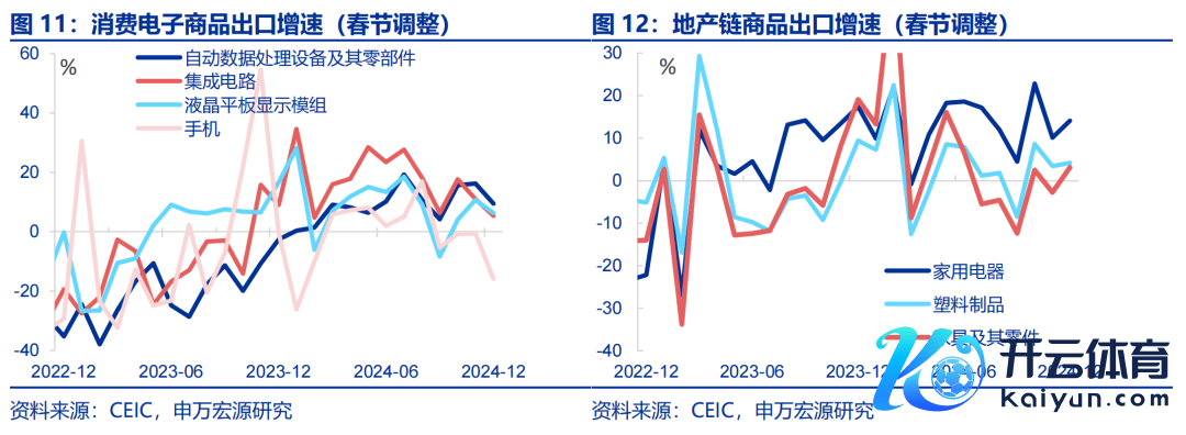 挥霍品方面,挥霍电子出口增速持续下行,而纺织服装箱包及地产链商品出口增速则有所回升。把柄海关公布的12月重心商品数据,挥霍电子出口增速持续下行(-7.1pct至1.1%),结构上为手机(-15.3pct至-15.8%)、自动数据管理成就(-6.7pct至9.5%)、集成电路(-5.7pct至5.3%)、液晶平板知道模组(-4.4pct至6.3%)所负担。相较而言,本月纺织服装箱包出口增速回升(+2.7pct至6.0%),其中纺织纱线(+7.9pct至17.2%)、服装(+2.4pct至6.2%)、鞋靴(+1.4pct至-0.7%)。此外,地产链出口比喻居品(+5.8pct至3.1%)、家电(+4.0pct至14.1%)、塑料成品(+0.8pct至4.2%)均较上月反弹。