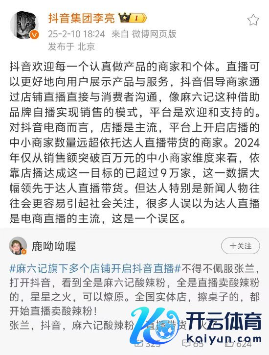 新浪科技讯 2月11日上昼音信,昨日晚间,抖音集团副总裁李亮微博发文回报了“麻六记旗下多个店铺开启抖音直播”一事。